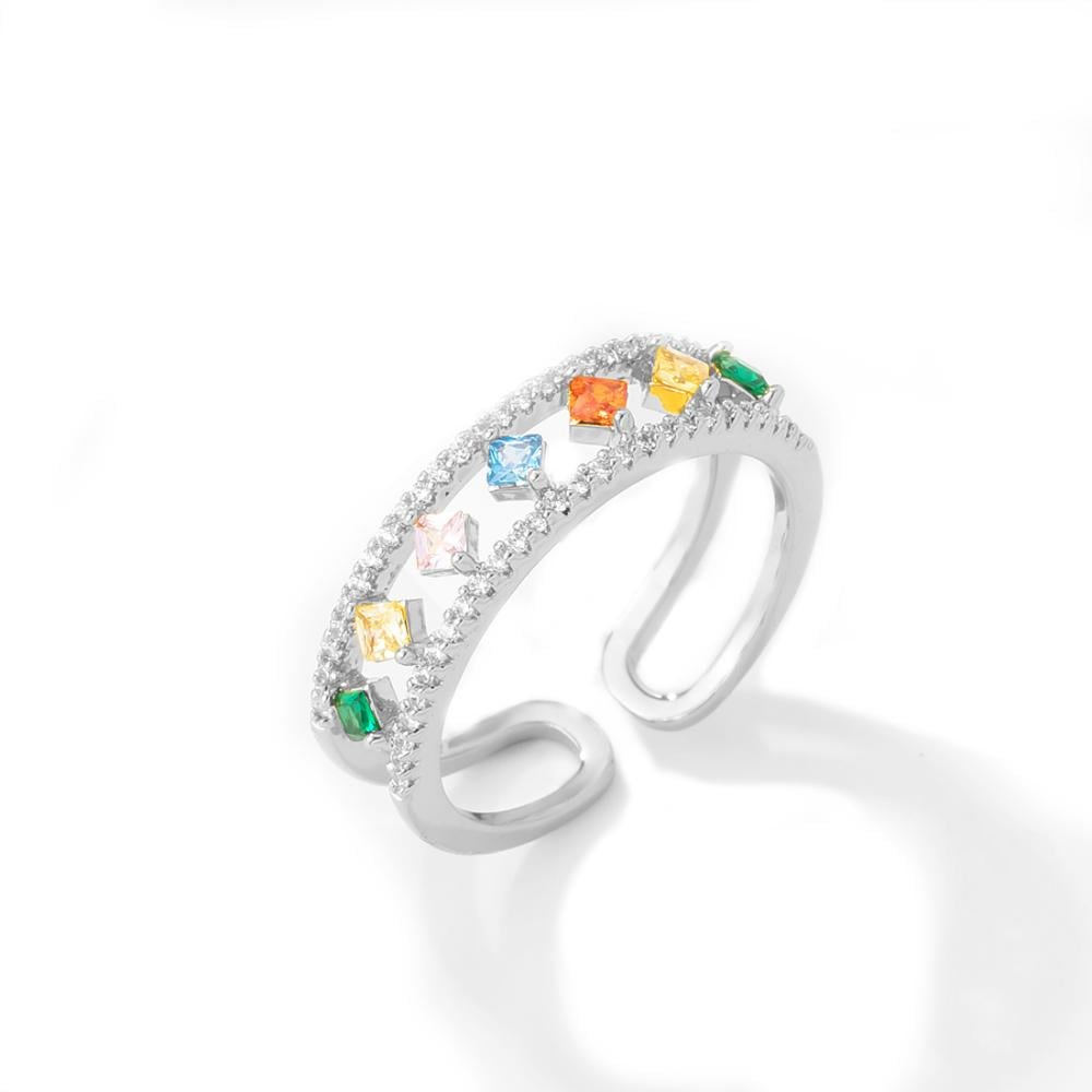 تميّزي مع خاتم فايلت الفضّي الملون المزخرف بأحجار الزركون اللامعة بألوان جذابة، تصميم فريد يجمع بين البساطة والفخامة ليمنحك لمسة من الحيوية والأناقة في كل إطلالة.