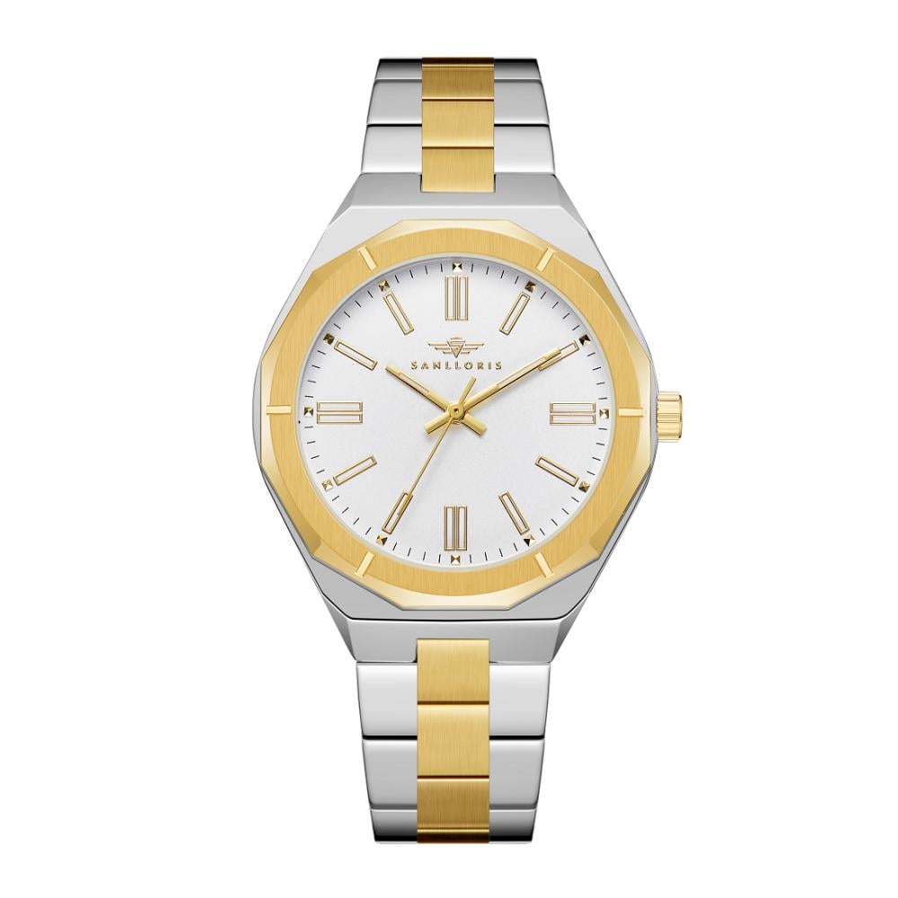 ساعة رجالية فضي ذهبي بمينا أبيض من ماركة سان لوريس بتصميم فاخر يجمع بين الأناقة والكلاسيكية، مما يجعلها خيارًا مثاليًا للإطلالات الرسمية واليومية. تضيف هذه الساعة لمسة راقية إلى أسلوبك.
