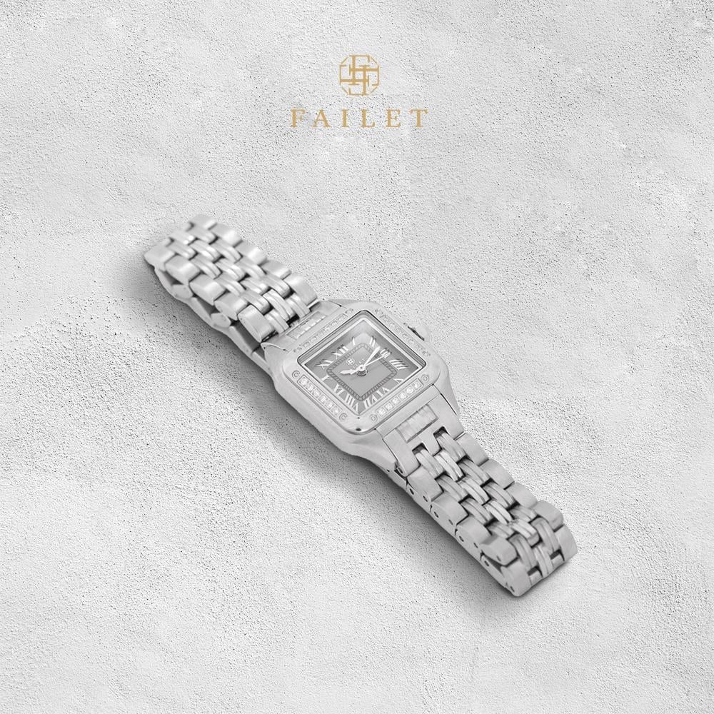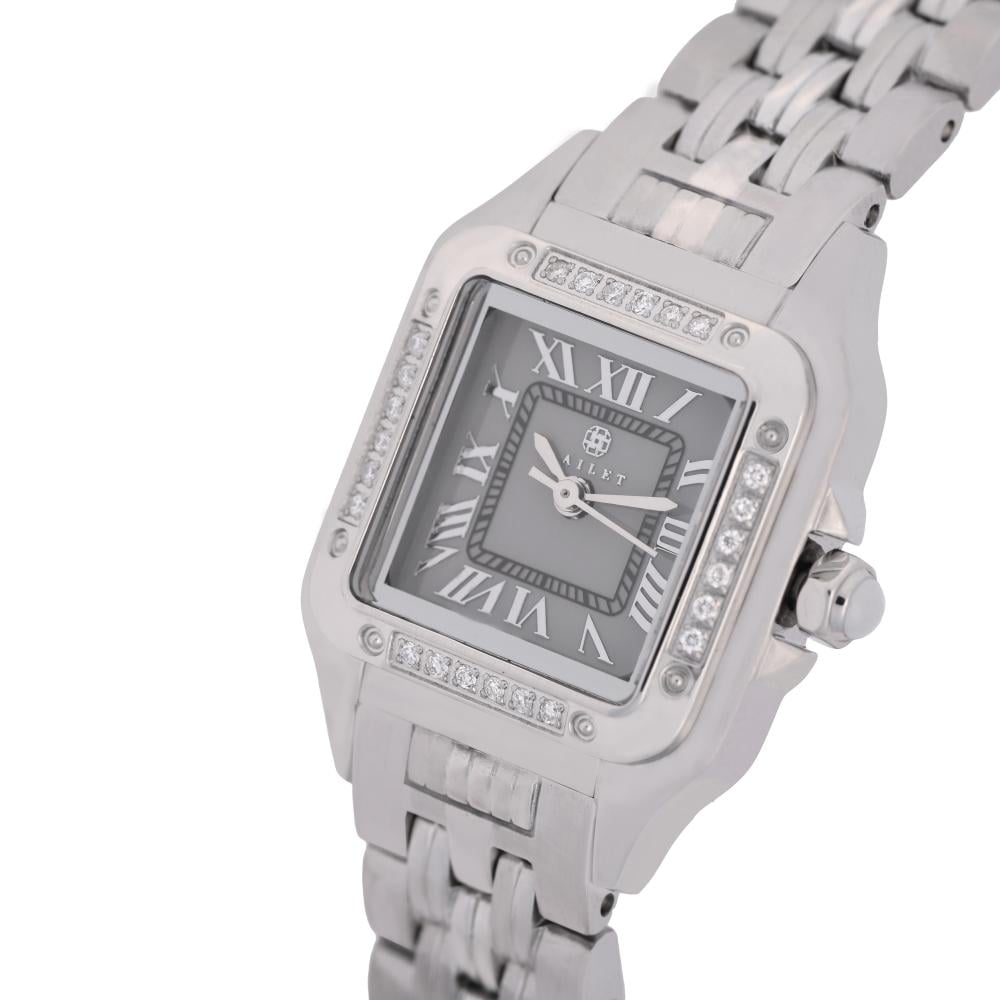ساعة نسائية ألماس فضي بمينا رمادي من ماركة فايلت بتصميم يعكس الفخامة والرفاهية لإطلالة أنيقة ومميزة.