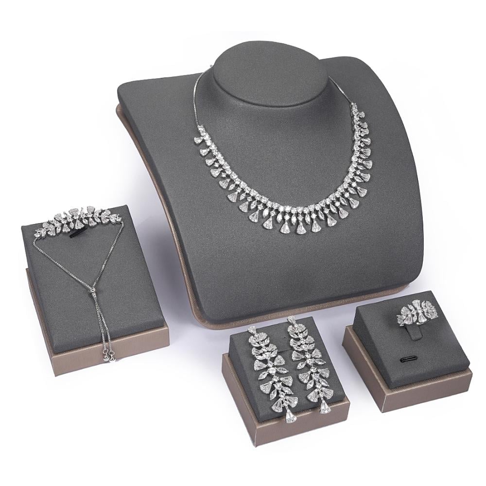 طقم زركون فضي بتصميم سحاب من فايلت يضم عقدًا، أساور، حلقًا وخاتمًا، مع أحجار زركون براقة وتصميم مبتكر مستوحى من السحاب، ليكمل إطلالتك بأناقة فاخرة.